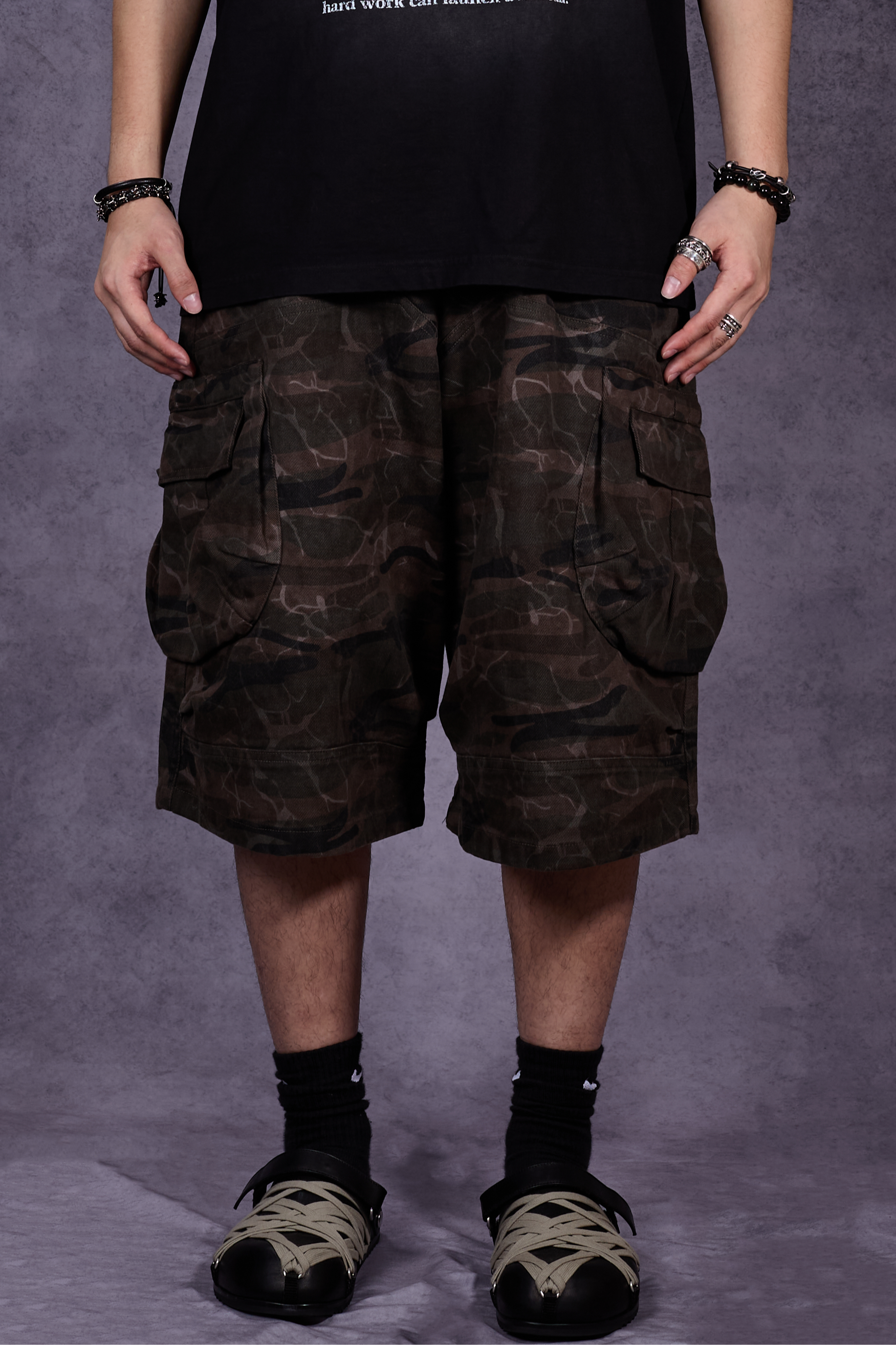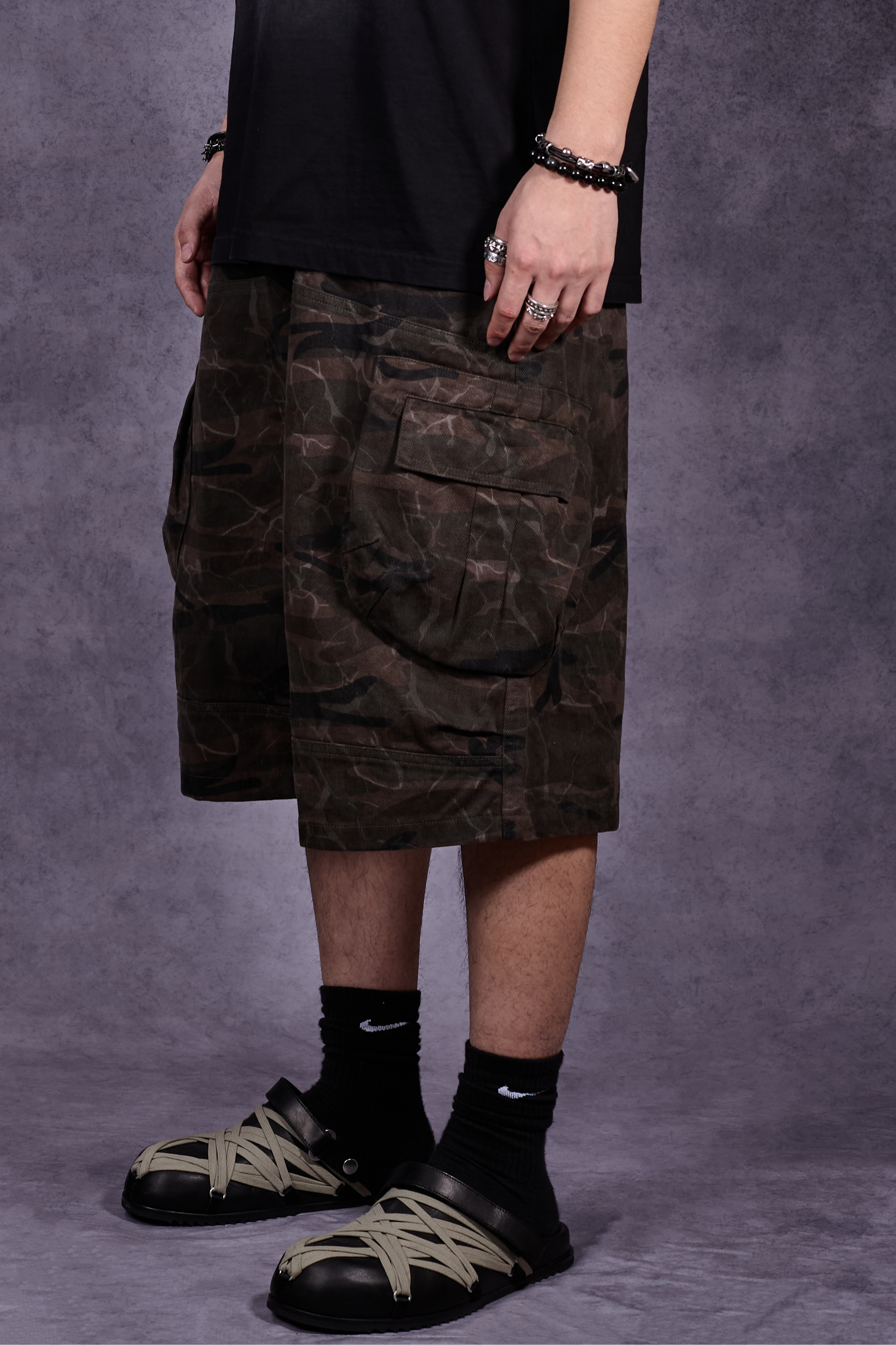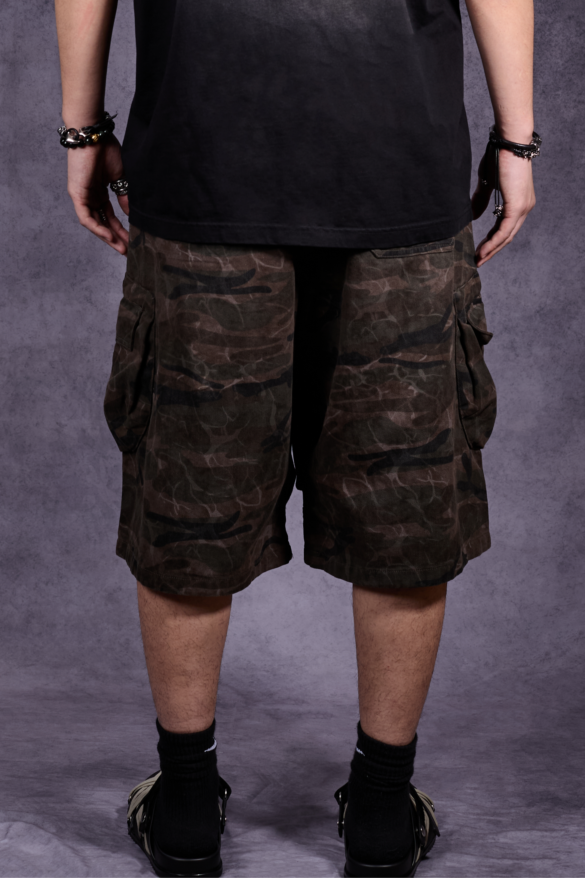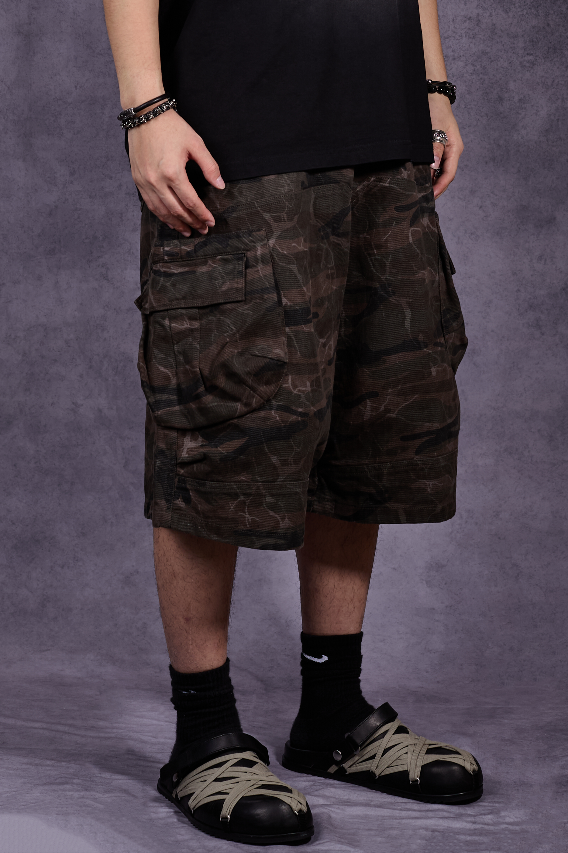 Built for urban movement and battlefield aesthetics, these cargo shorts feature an all-terrain camo print and a bold, structured silhouette. With multi-pocket functionality and a washed finish, they balance rugged utility with everyday comfort. Whether you’re hitting the streets or laying low, these shorts carry presence.