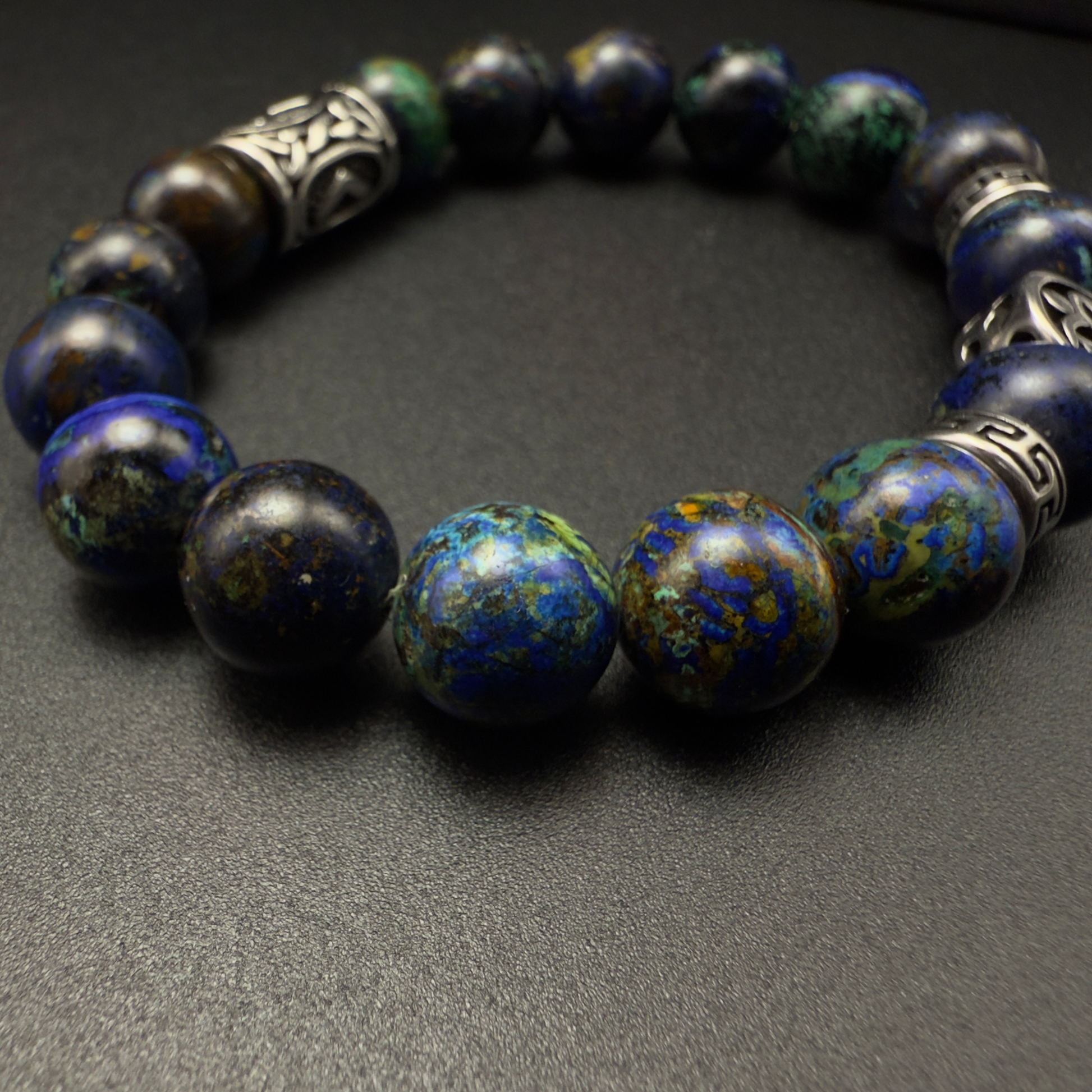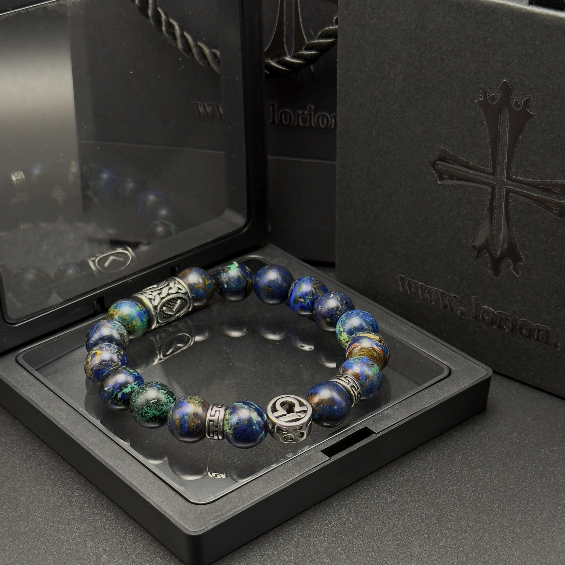Crafted with deep-space hues of natural Azurite Malachite, this piece channels the mysterious pull of the cosmos. Swirling shades of oceanic blue, earthy green, and stardust flecks are anchored by engraved stainless steel spacers, including Lorion’s signature logo charm. The contrast between organic mineral chaos and sharp metallic geometry creates a visual rhythm of raw elegance.