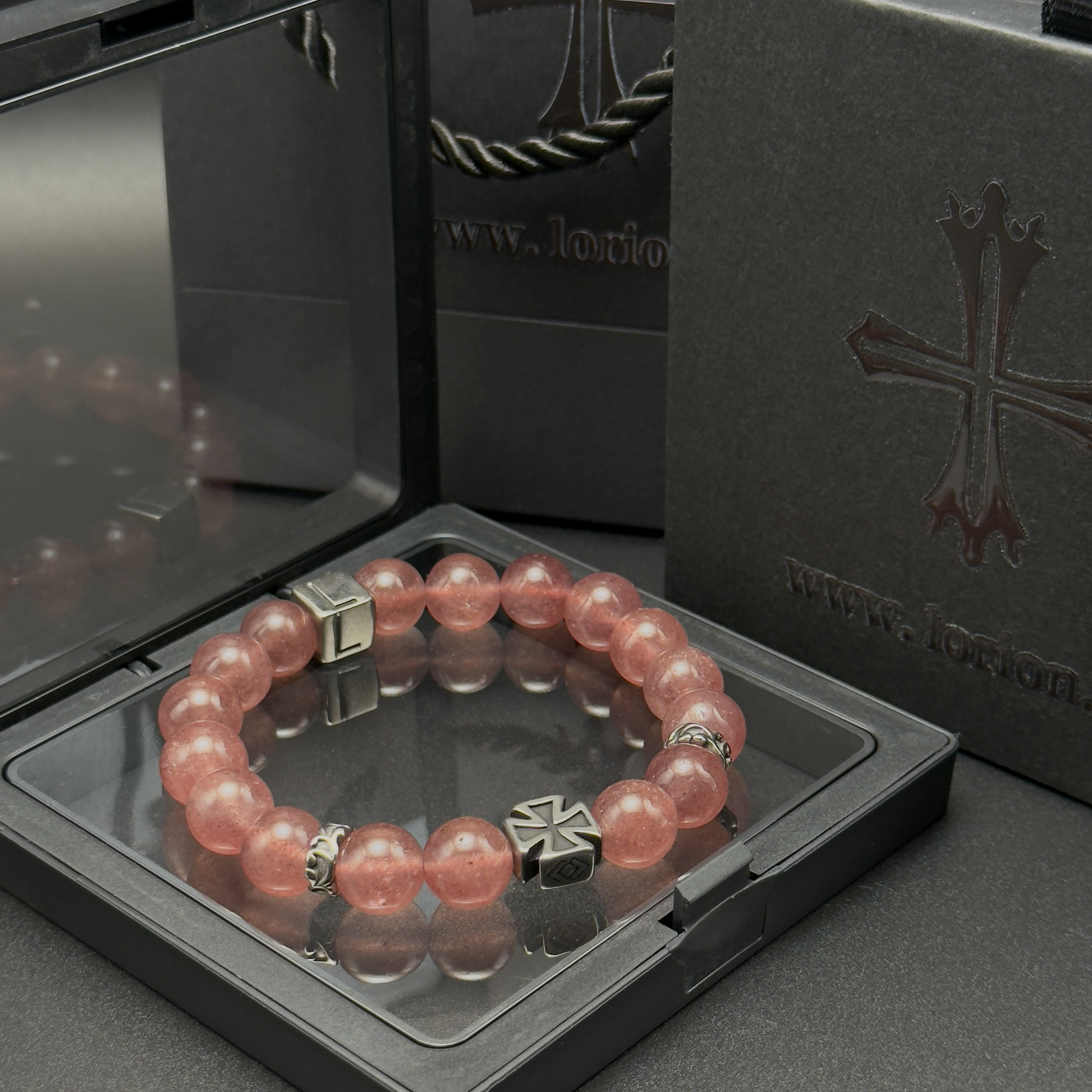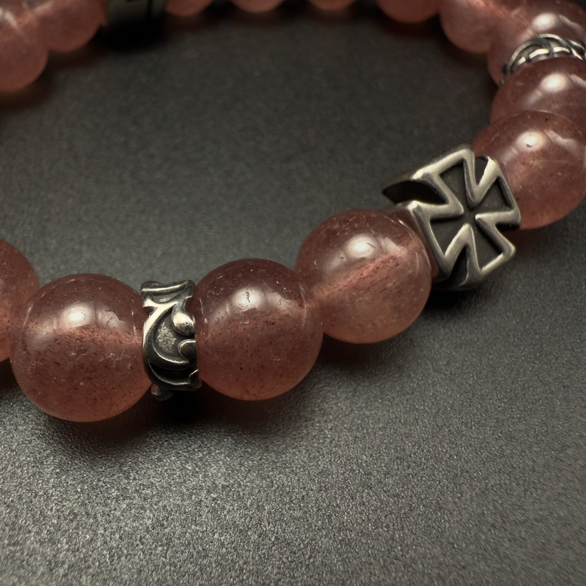 Crimson Grace is forged with natural strawberry quartz, each bead holding an inner galaxy of soft red light. Often called the stone of emotional courage, strawberry quartz inspires self-love, resilience, and radiant openness. Balanced by iron-cross steel accents, this piece becomes a contradiction in form — a fusion of heart and armor.