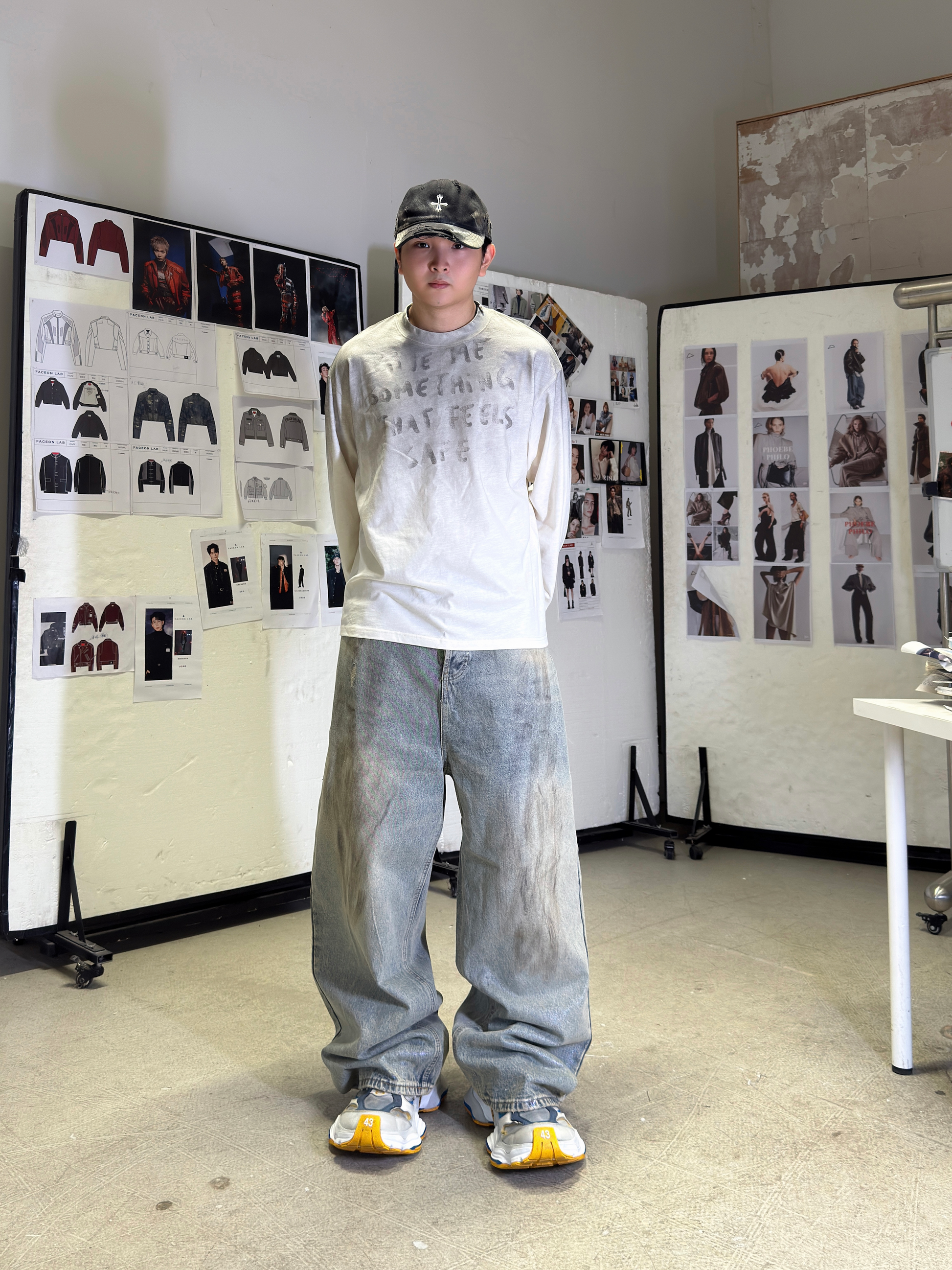 Front text “GIVE ME SOMETHING THAT FEELS SAFE” captures a quiet sense of longing — a raw, emotional statement expressed through simplicity.