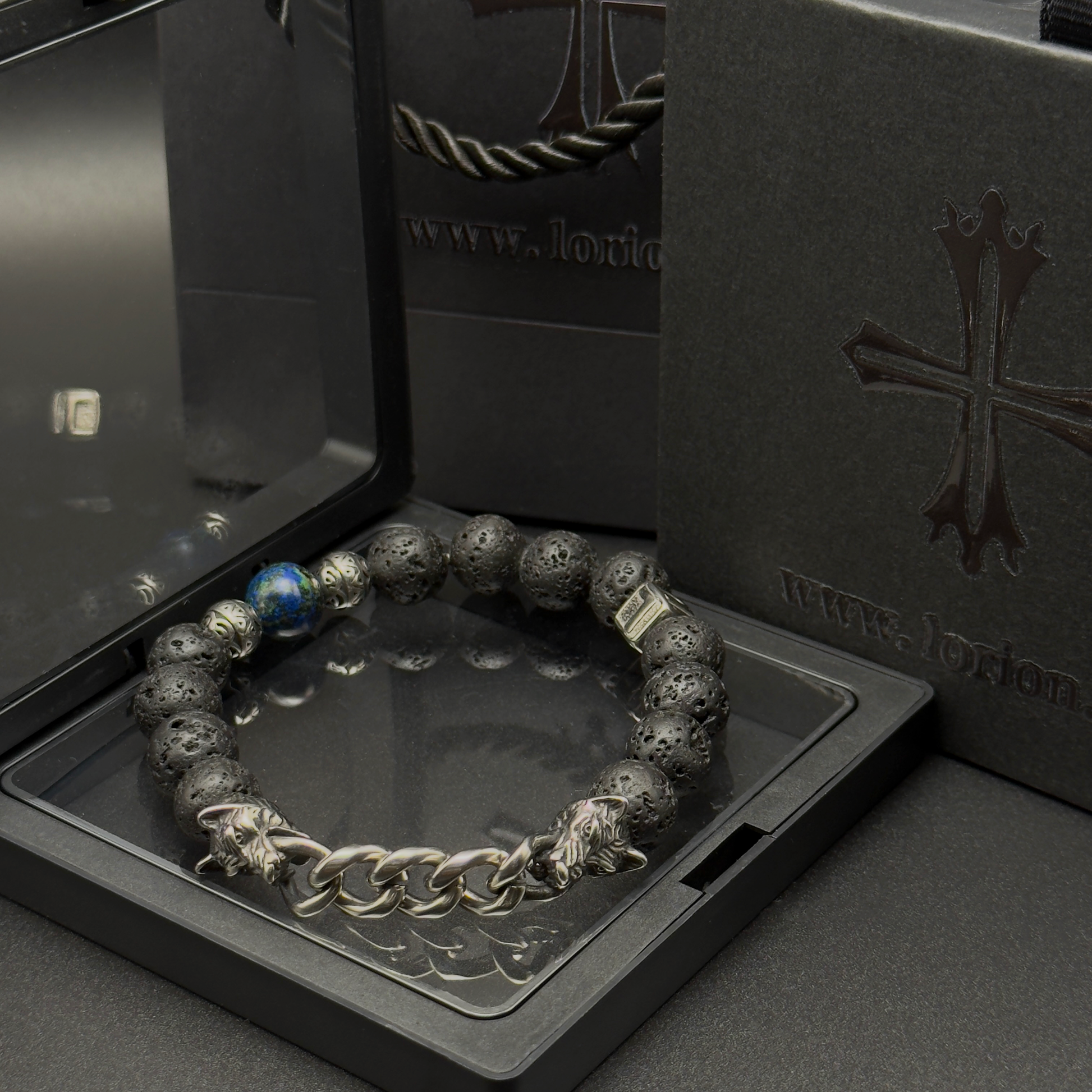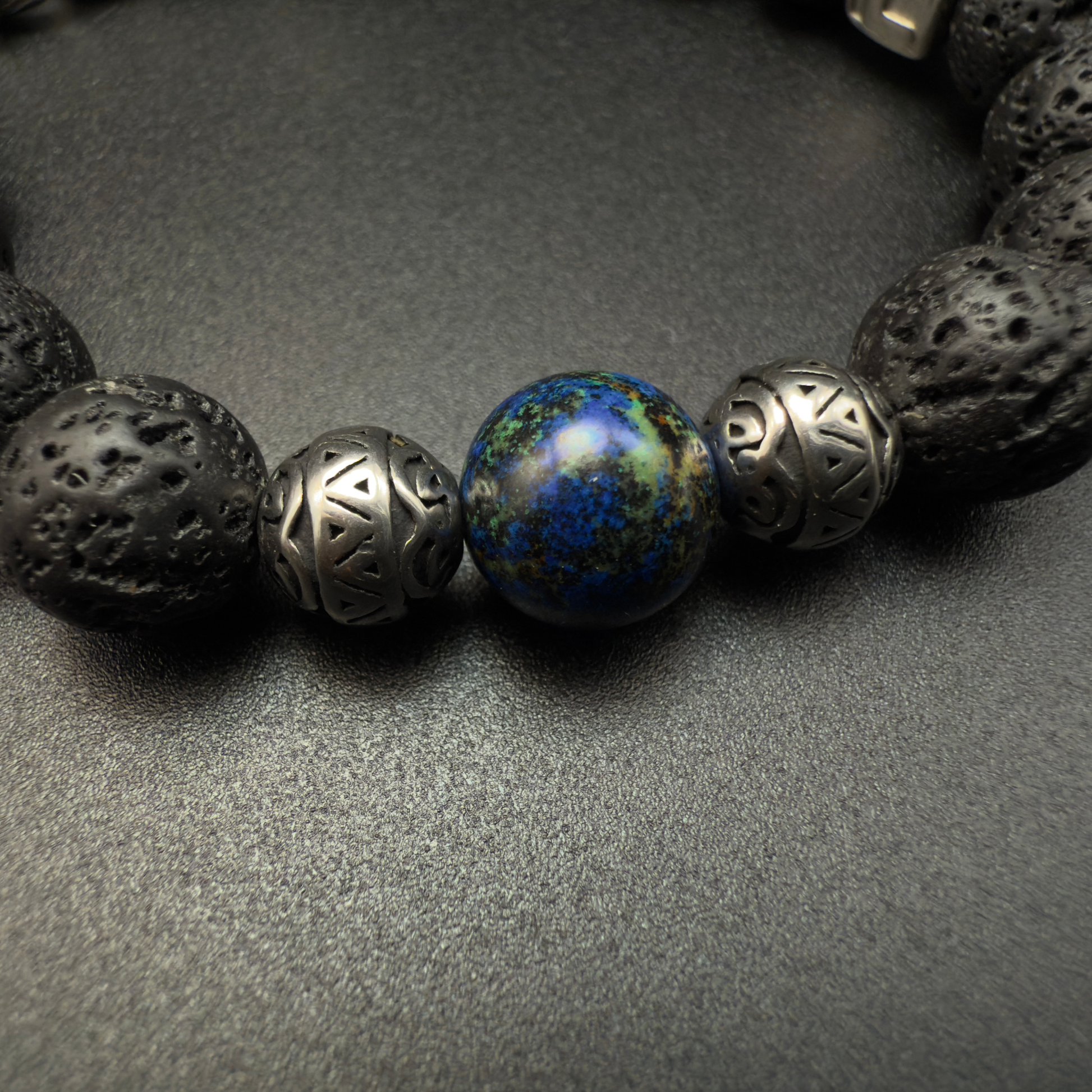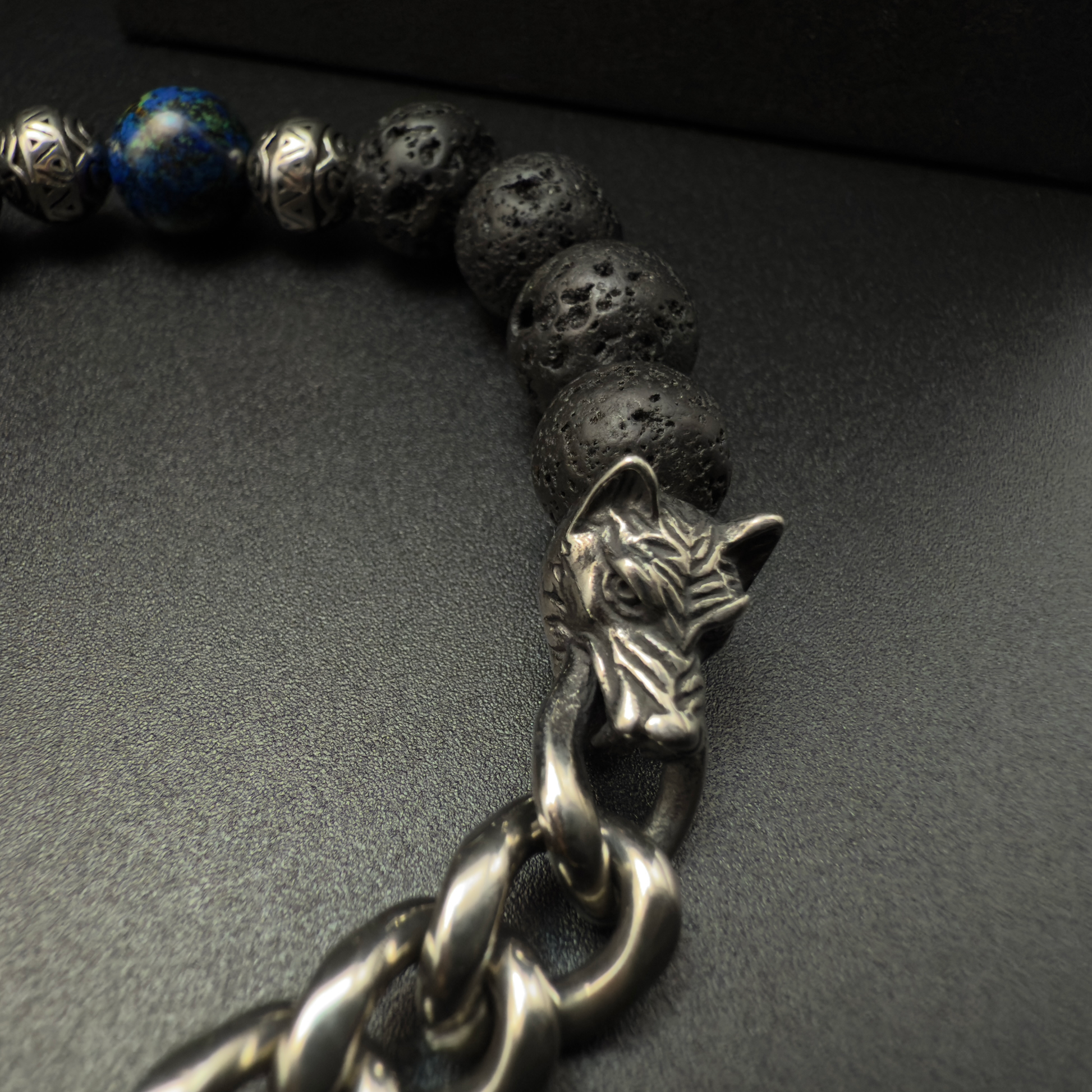 The Forgeborn bracelet is crafted from raw lava rock beads, forged in the earth’s core and cooled by time. These stones breathe with primal energy — porous, rugged, alive. Anchoring the flow is a single azurite-malachite bead, a spark of insight in a storm of instinct. Twin steel wolf heads clasp the piece together, symbolizing loyalty and survival.