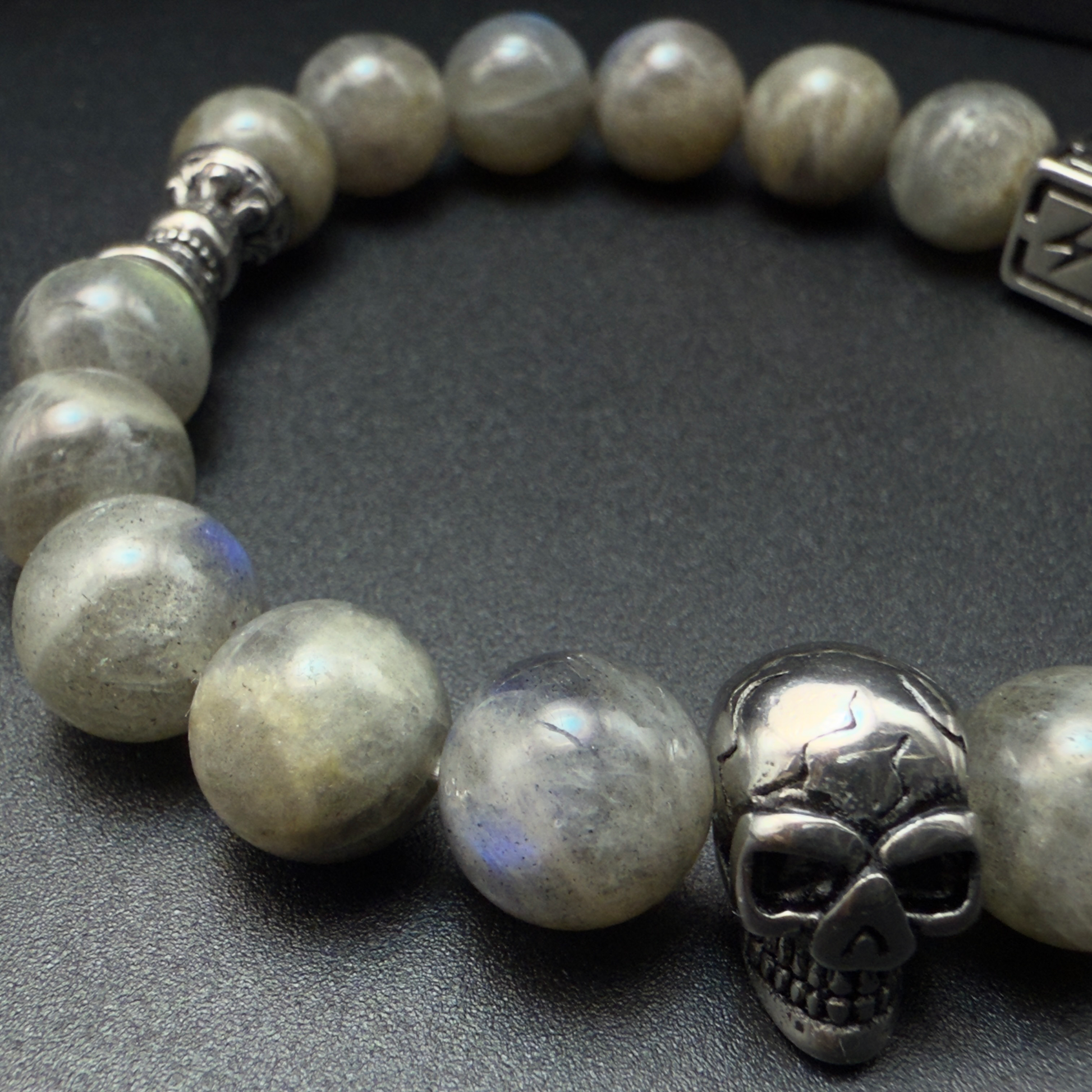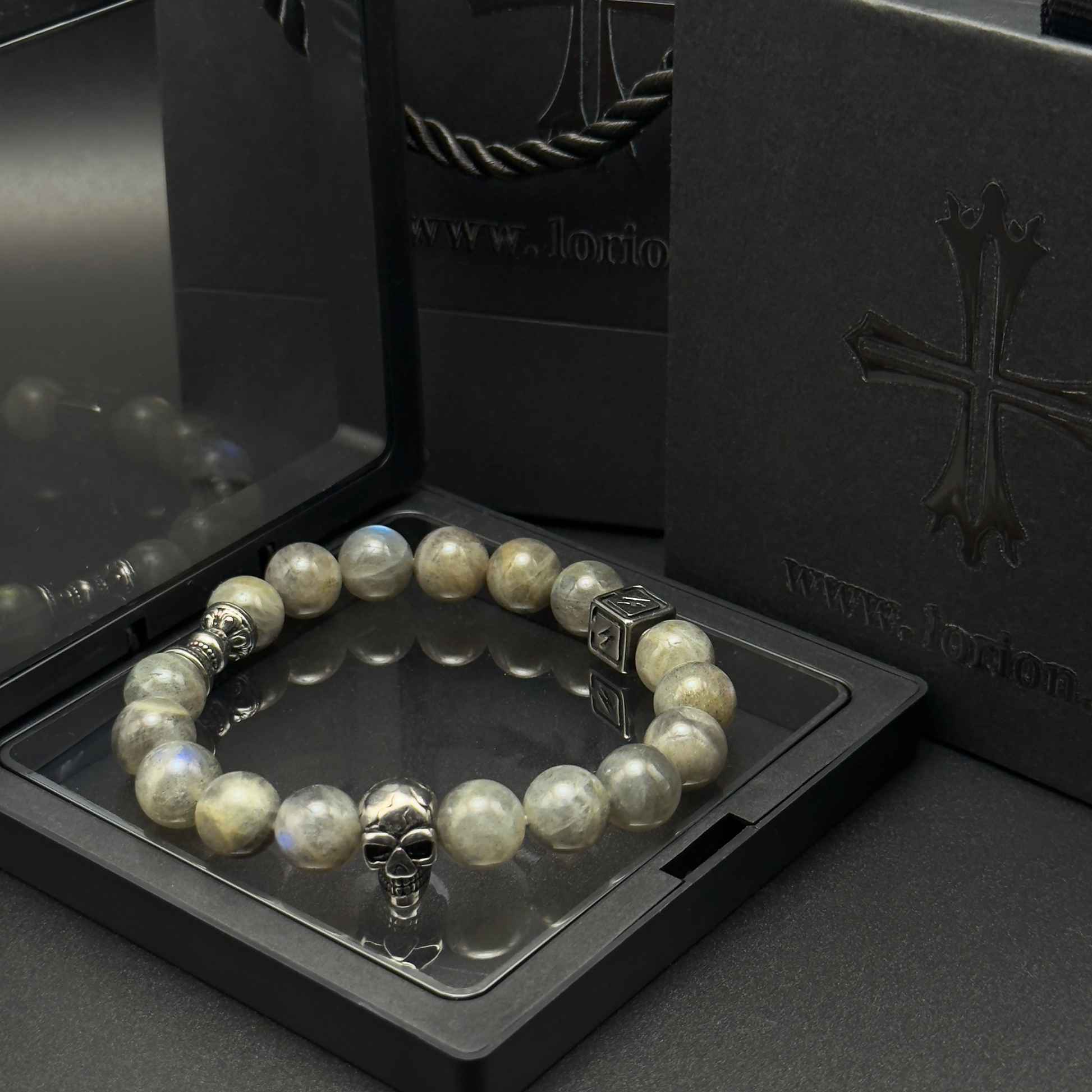 Like distant light breaking through a dream, Moonwake is crafted from natural labradorite — a stone of transformation and hidden realms. Its muted tones conceal a shifting inner fire, only visible in certain angles, like truth glimpsed through still water. A skull charm anchors this energy in mortality, while a crown bead represents elevated consciousness — death and divinity in one pulse.