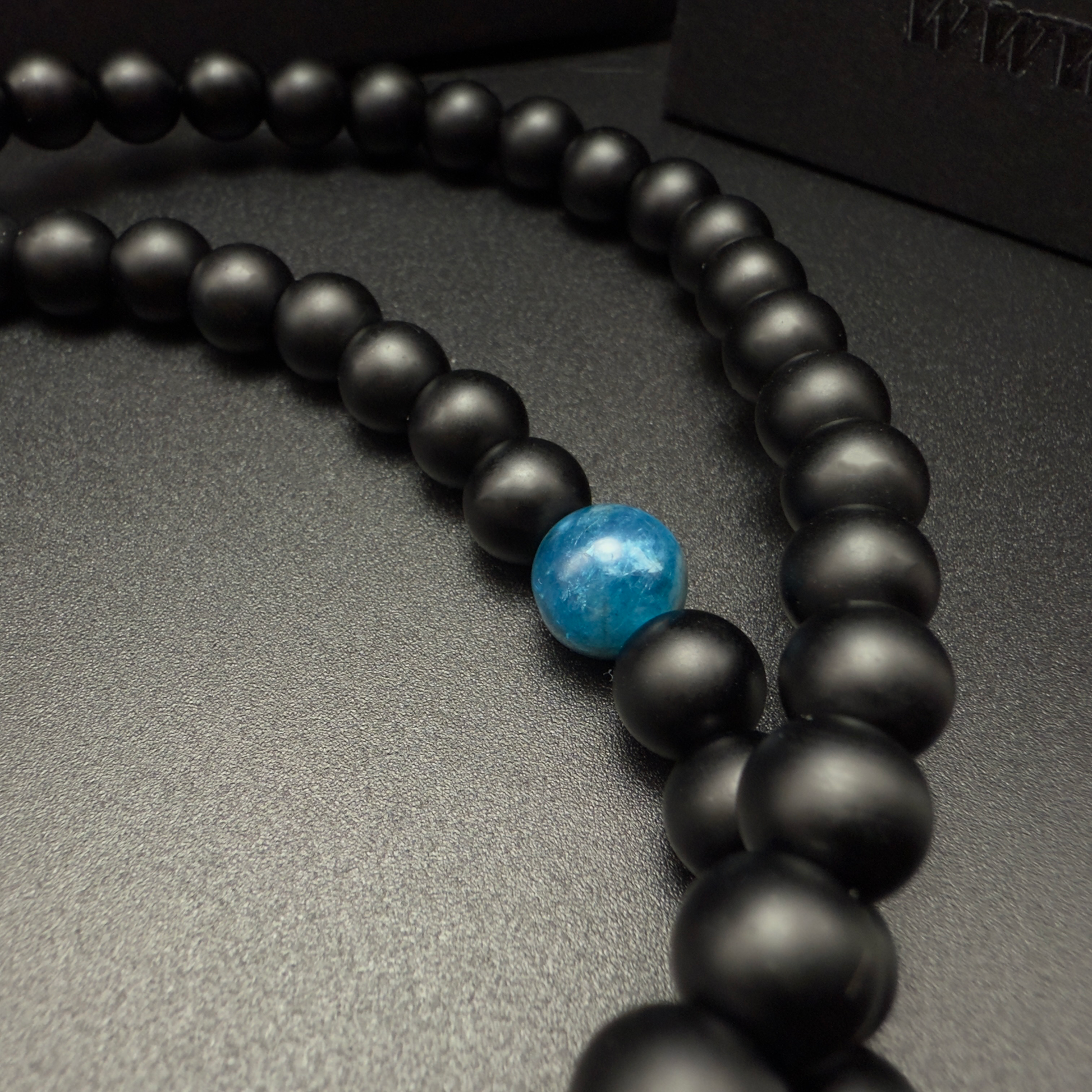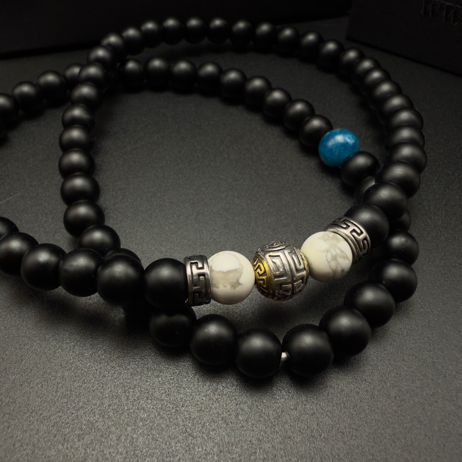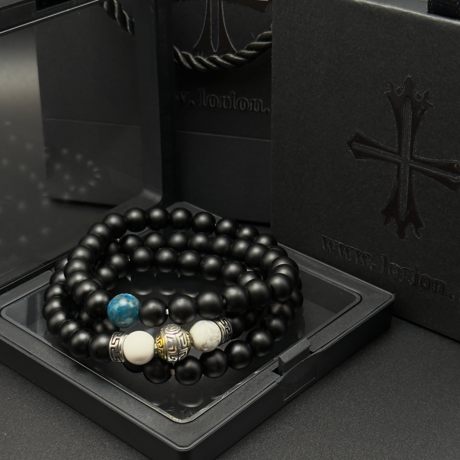 This twin-layer onyx bracelet echoes the same central alignment — white howlite for mental peace, and a carved silver-gold core for shared structure. Worn with its pair, it becomes a spiral of resonance — two souls orbiting the same truth.