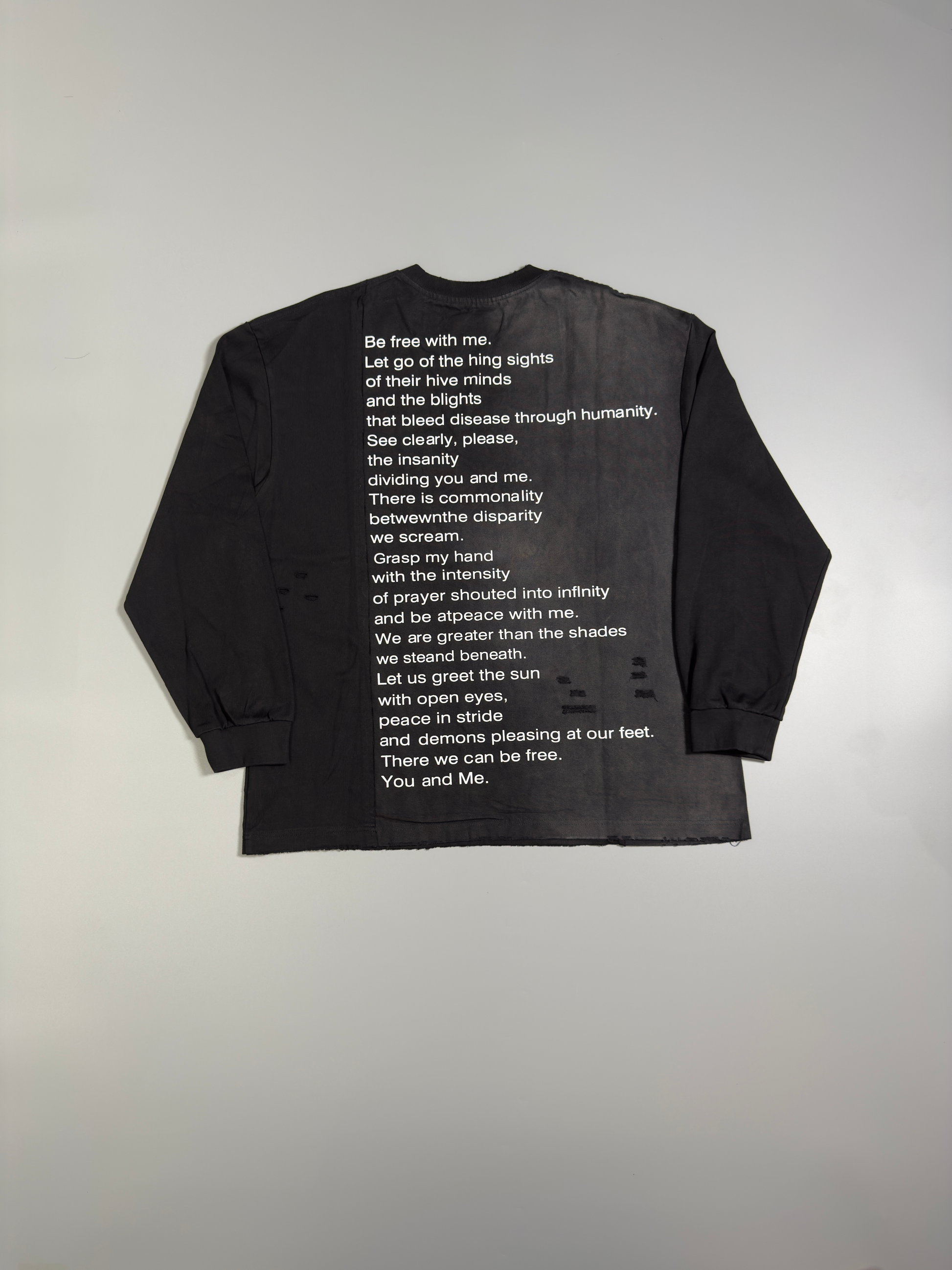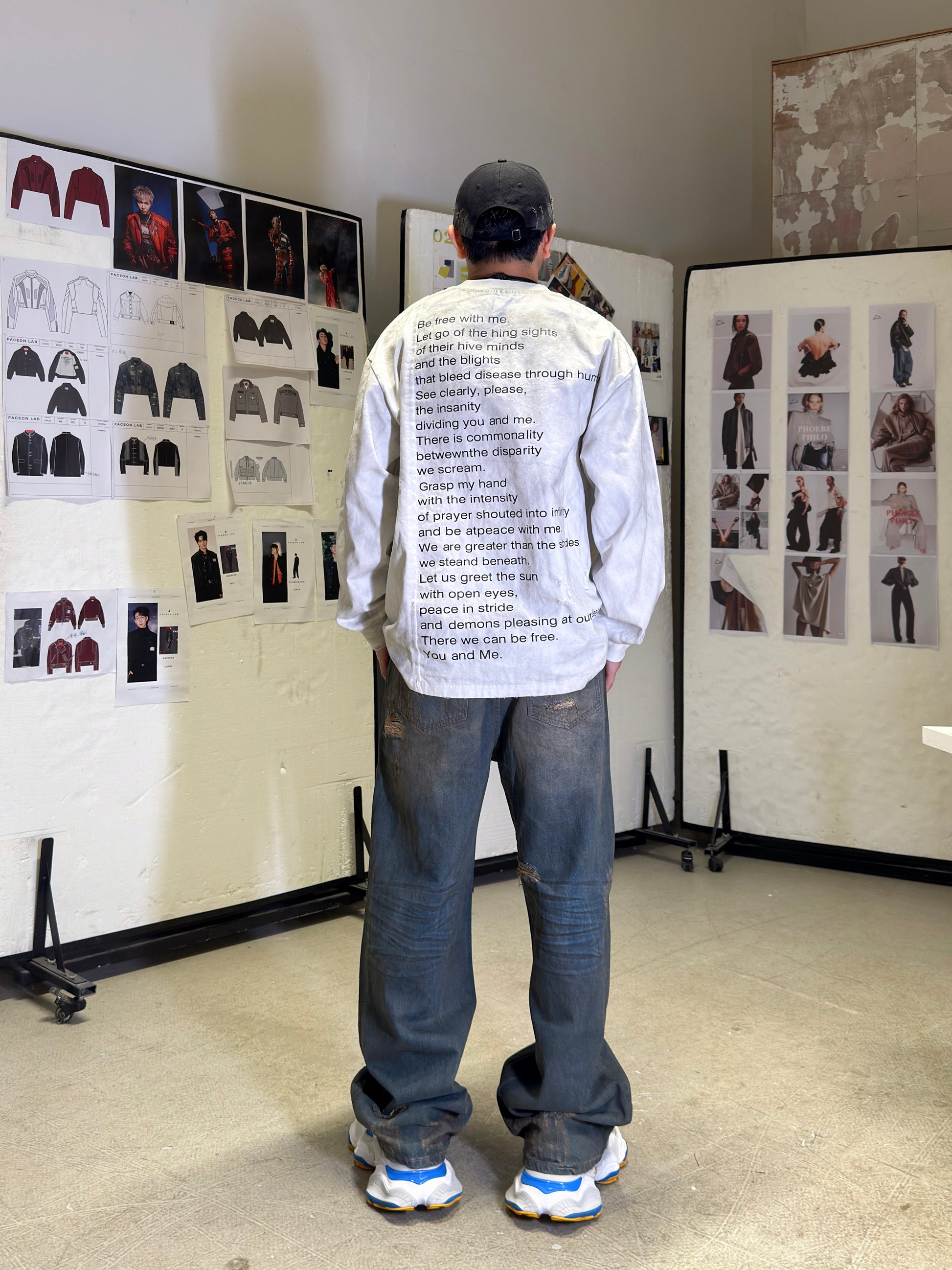 The poem on the back conveys freedom, connection, and shared clarity — an ode to individuality within chaos.