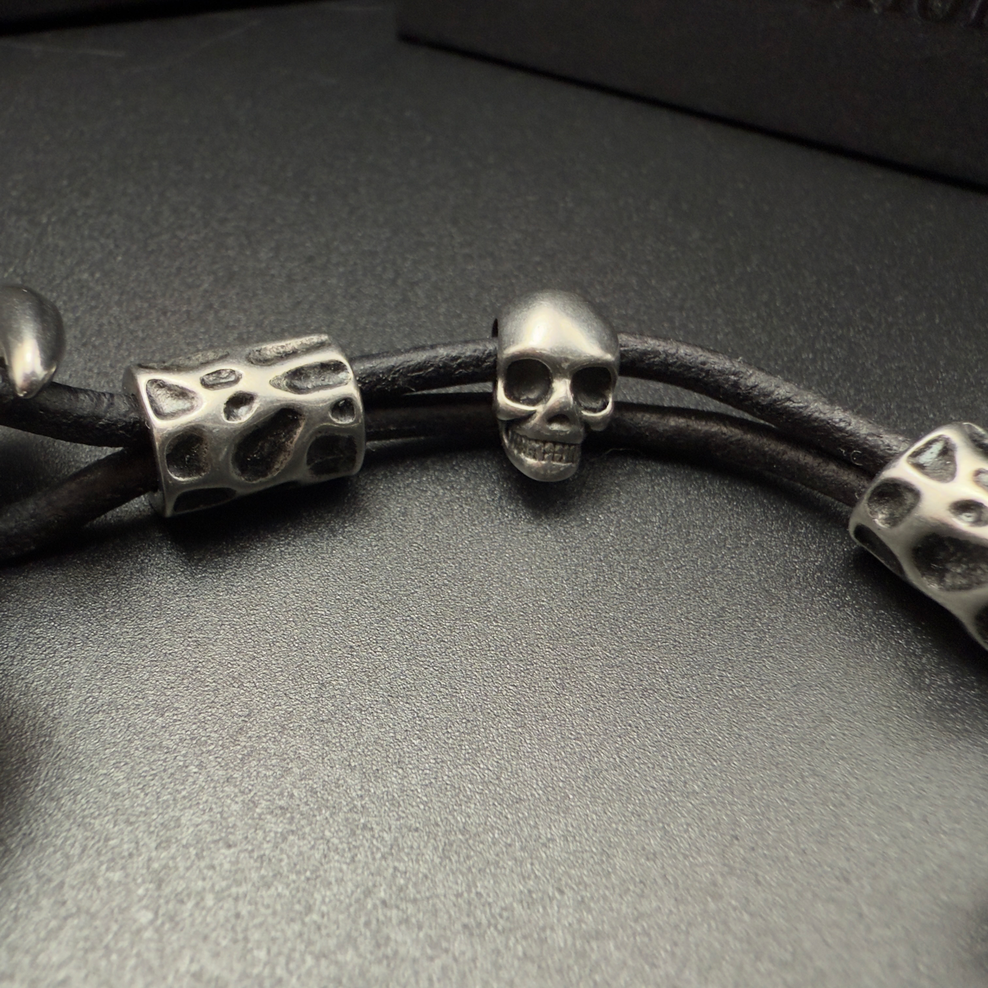 Scrap God is a brutalist fusion of hand-patinated steel modules, skull charms, and black leather rope. Every piece bears the scars of survival — melted forms, hollow fragments, and primal textures. The claw-hook closure is not just a fastening — it’s a weaponized symbol of connection.
