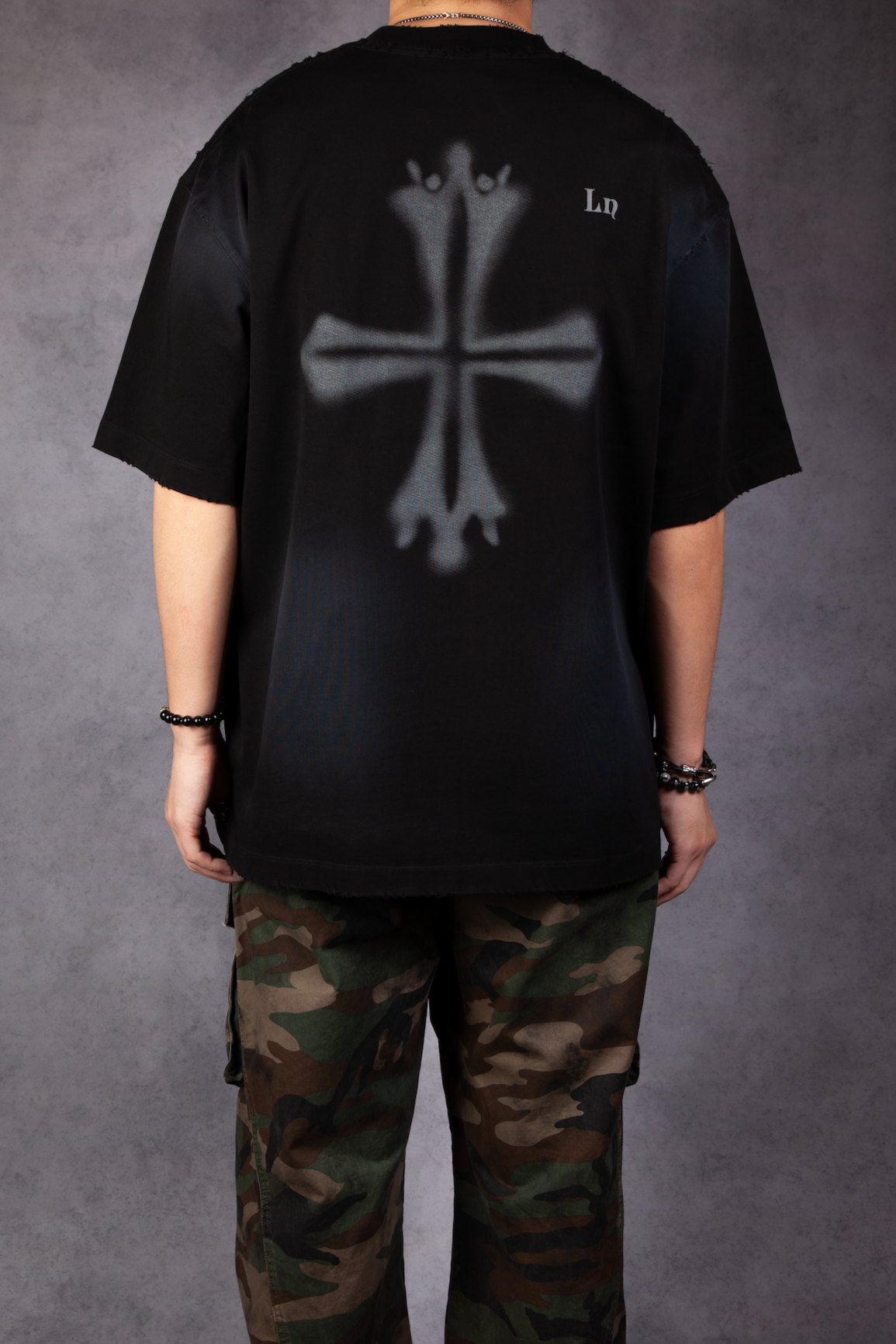 This tee features a subtle embroidered Lorion neck tag, contrasted with an airbrushed-style gothic cross on the back.
