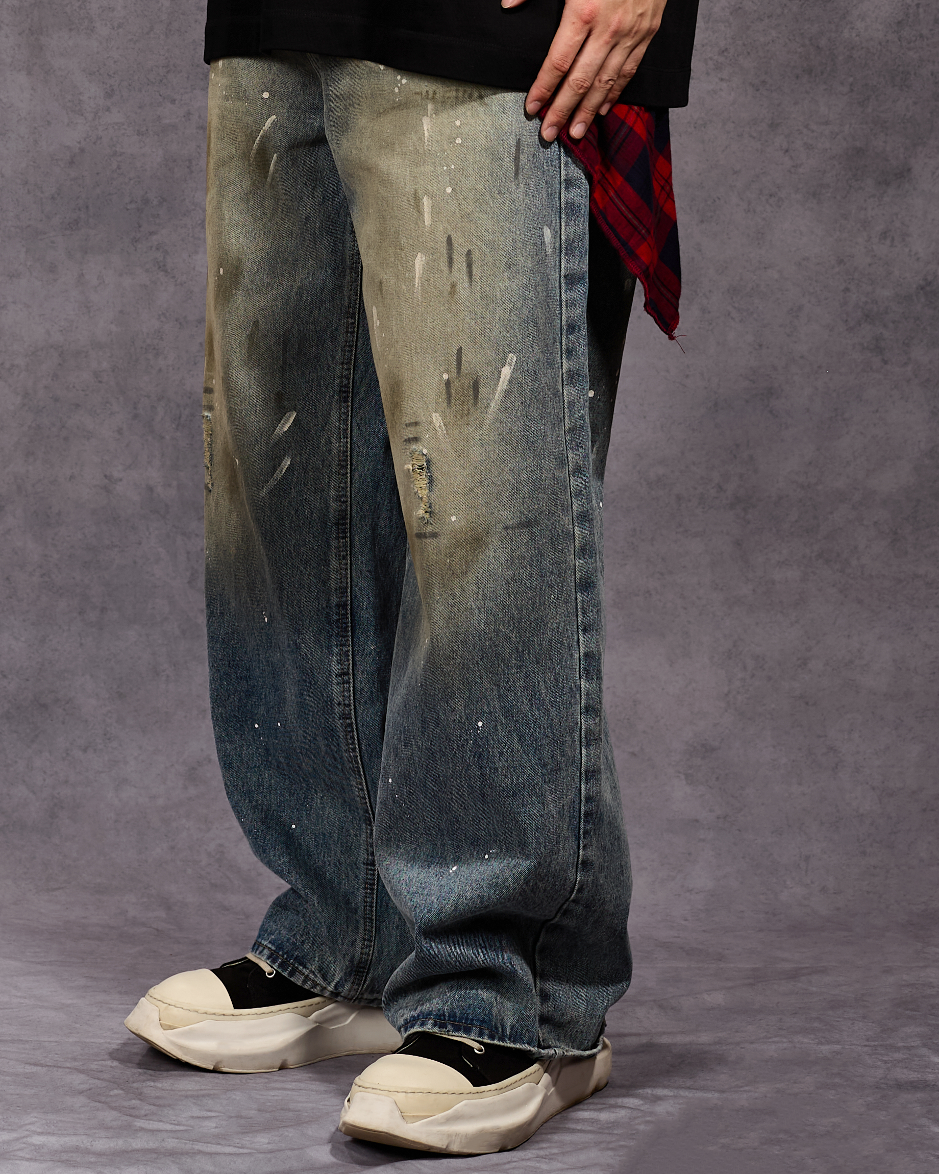 Vintage-washed denim with subtle paint splatter for a gritty street vibe