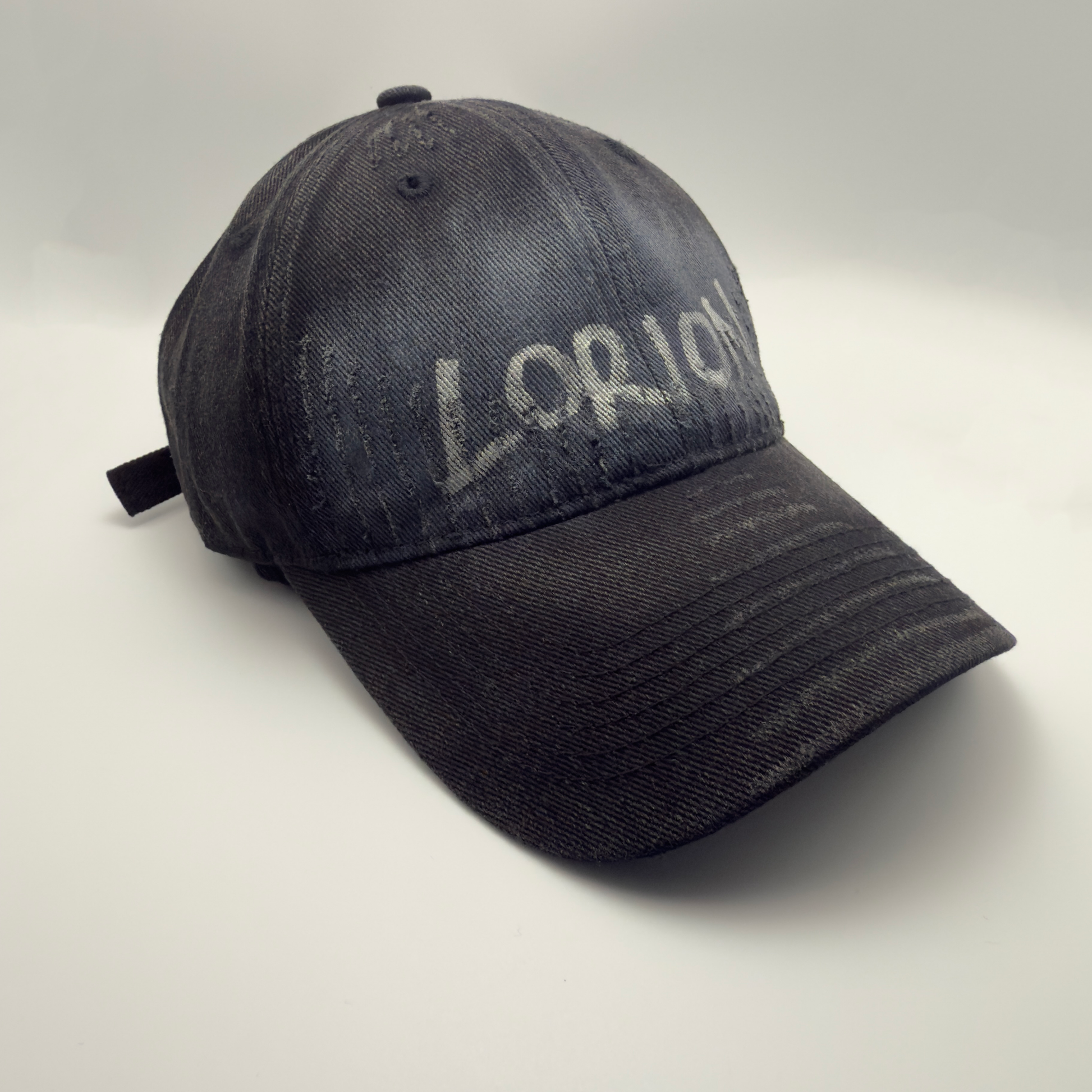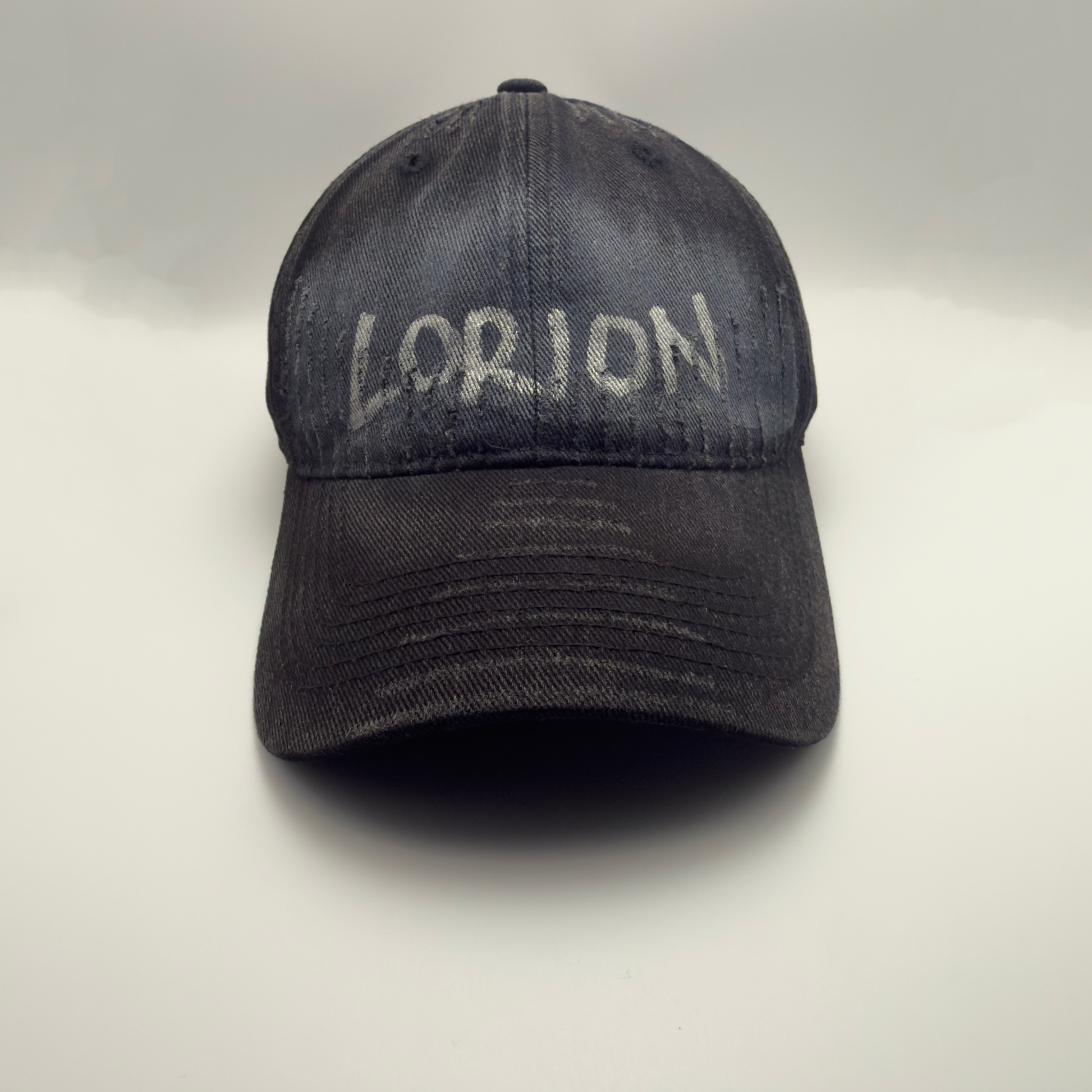 This cap strips away polish and leans fully into the underground. The washed-out black cotton surface is hit with a rough spray-painted LORION tag across the front—a nod to alleyway walls, raw expression, and late-night rebellion.